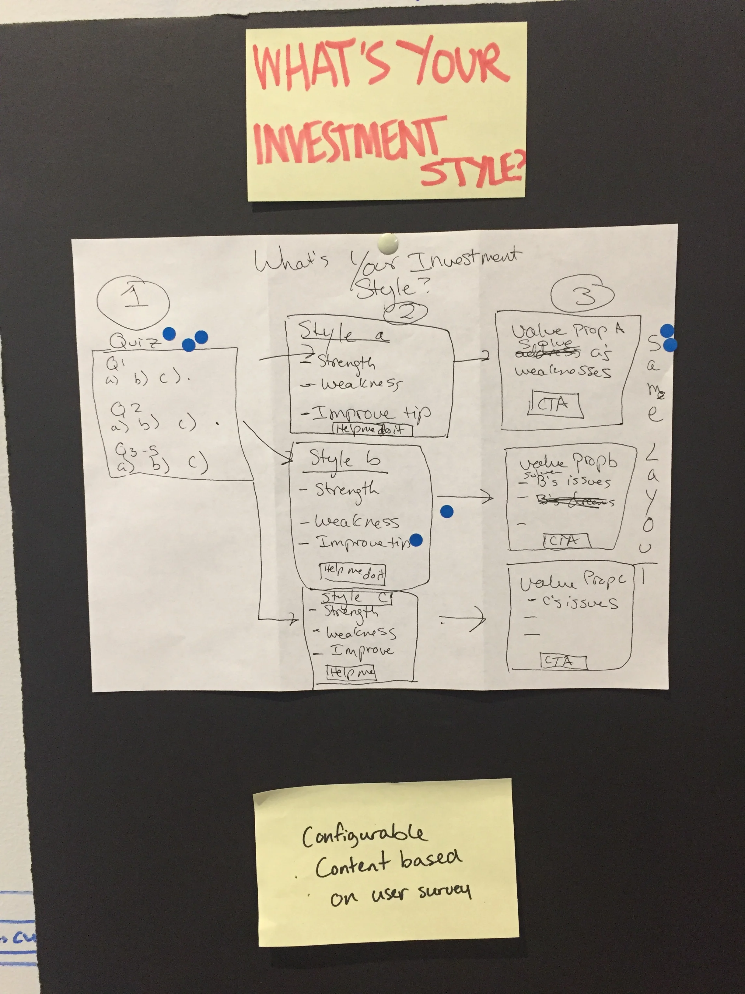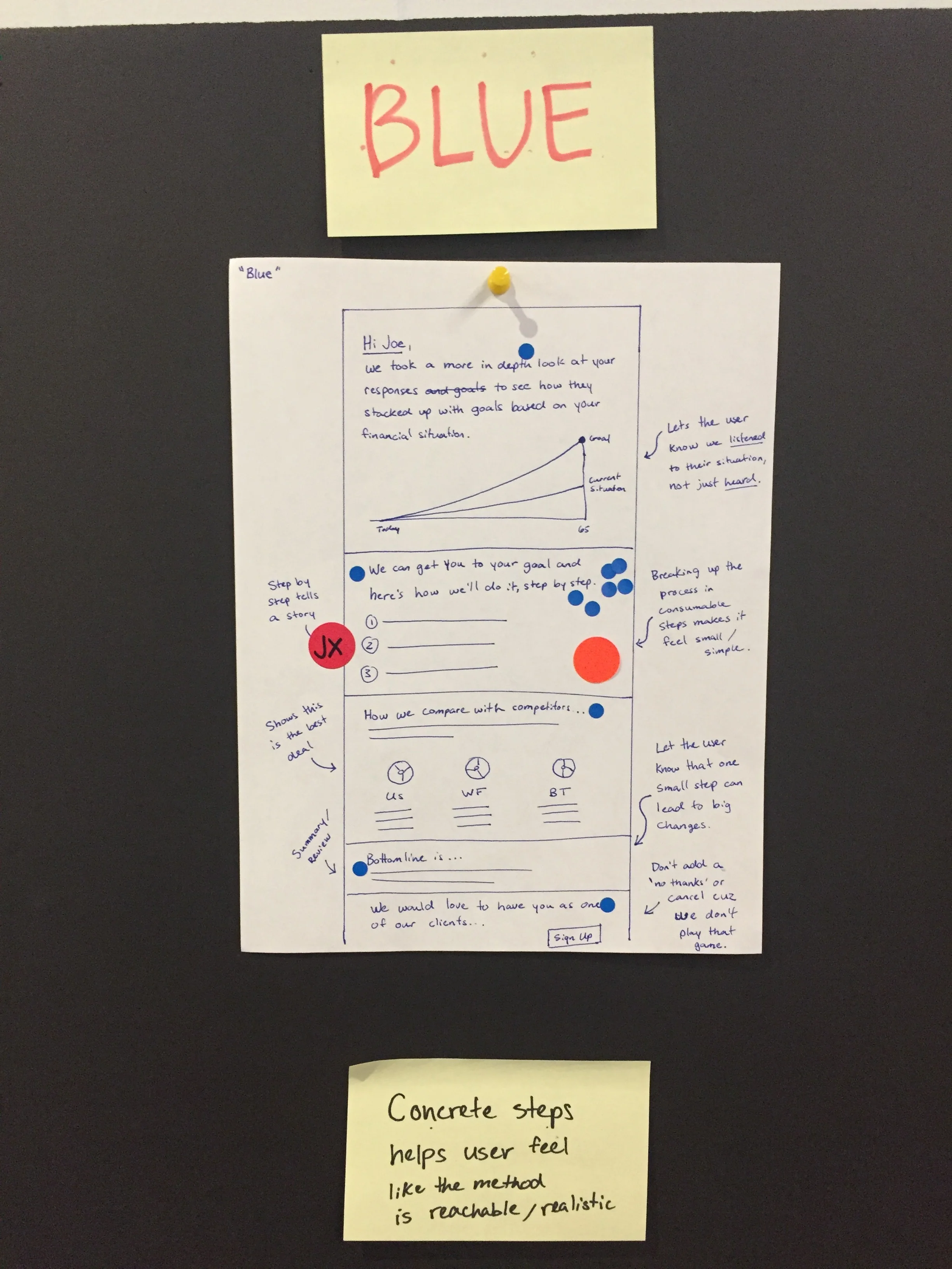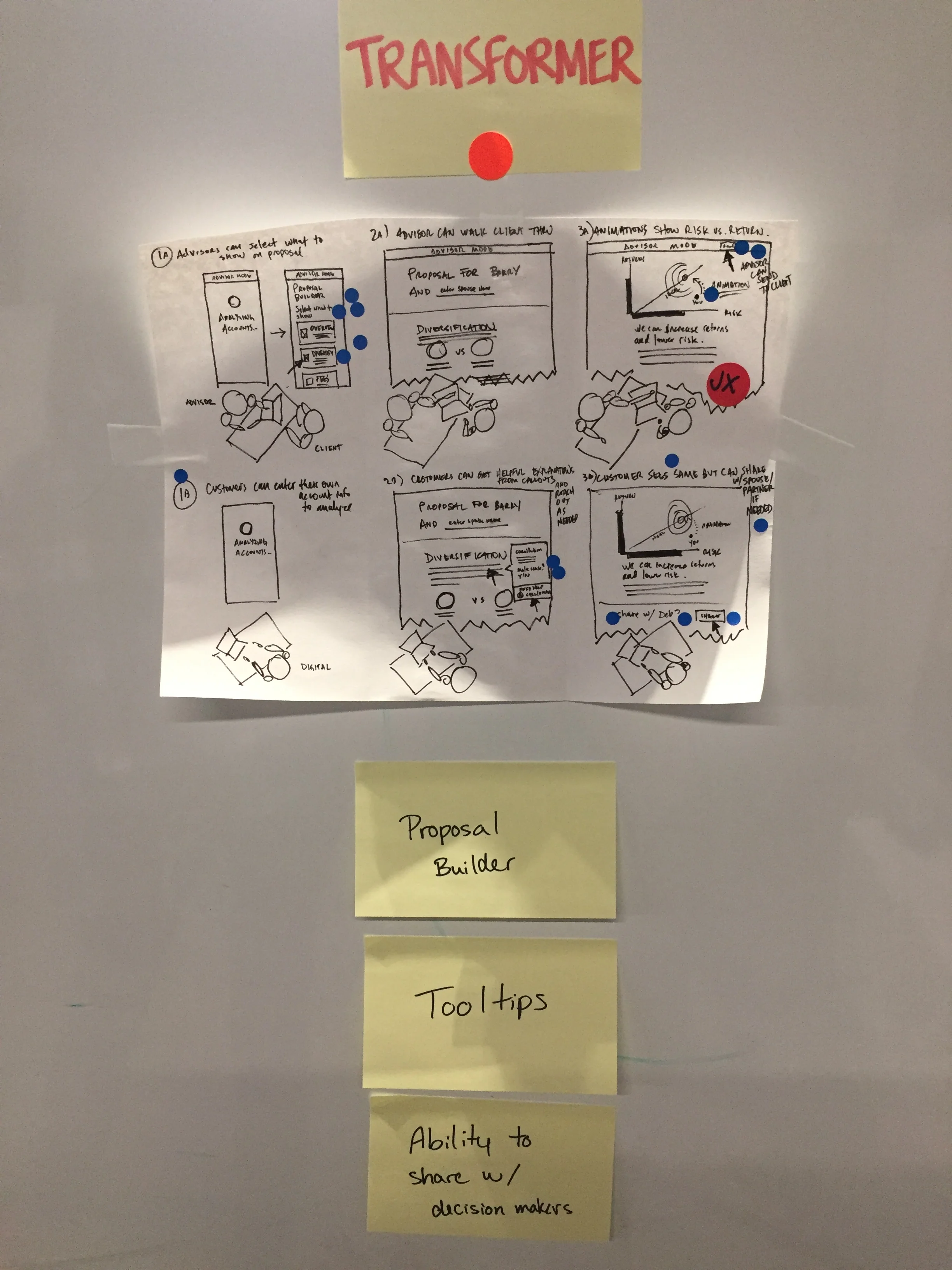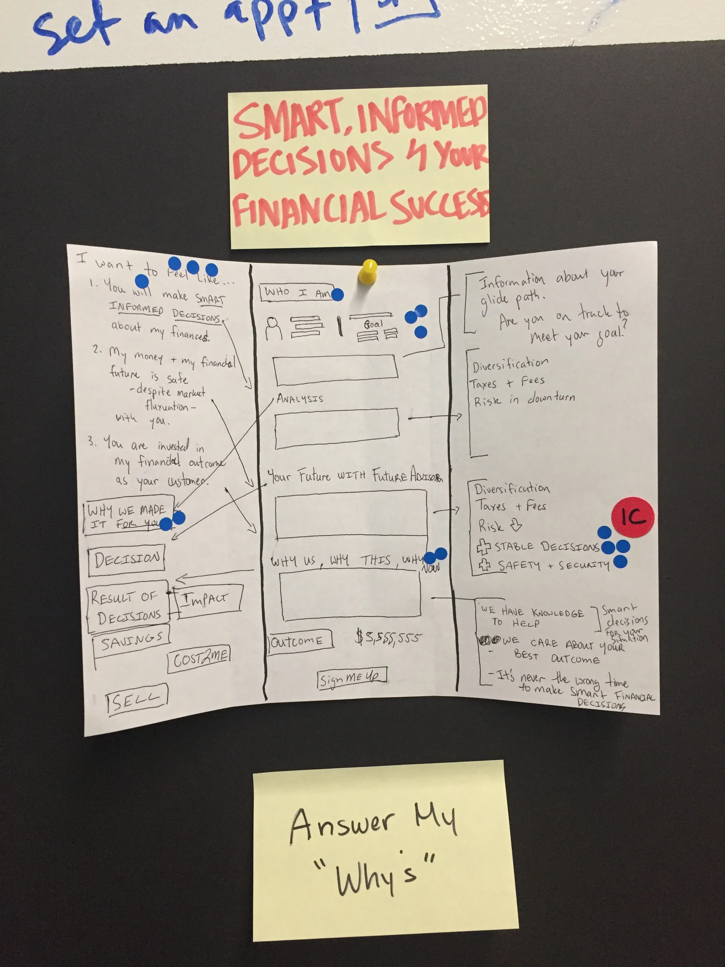 Postscript: At the end of each sprint day, we consolidated our ideas onto this board. It was a practical and motivating way to track progress. At the time of writing, it still lives in the FutureAdvisor office. Coworkers from across the company, new hires, and partners stop by the board to get a peek into our design process.