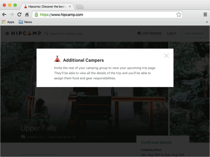 Hipcamp found that their users tend to book campsites for groups of +4 people, most of whom are not registered users. Hipcamp challenged us to design a feature that would incentivize those campers to join Hipcamp.